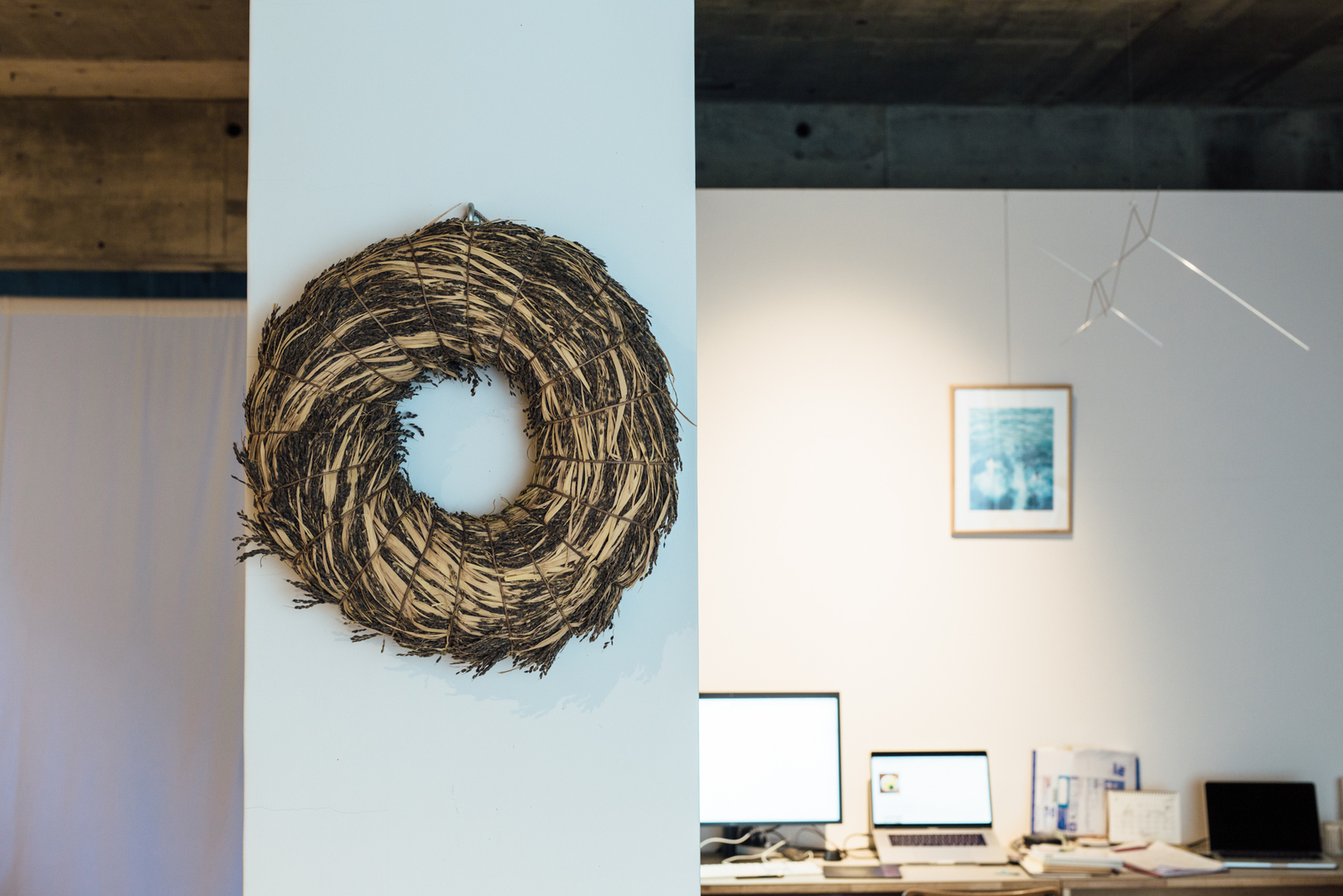 愛媛県出身の作家、二名良日(ふたなよしひ)さんがつくるリースは迫力があって圧巻。青竹のリースや、蝋梅の枝を編んだリースだとか、ススキを輪っか状に編んだ後、和紙を貼り付けた作品とか…。侘びと寂びのある大変素晴らしい草輪だった。どれも素晴らしいリースで、とても迷ったが、写真のリースを一つ連れて帰った。有機無農薬栽培の紫餅のリース。僕たちらしいリースだと思う。まさに一粒万倍。