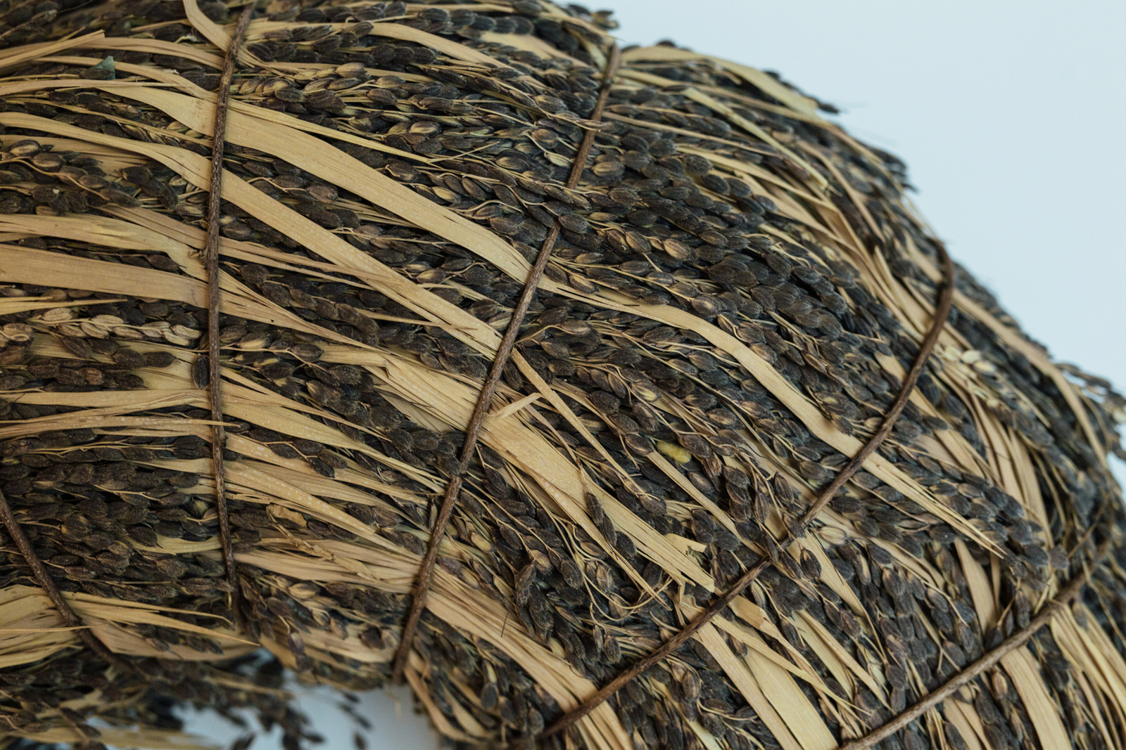 愛媛県出身の作家、二名良日(ふたなよしひ)さんがつくるリースは迫力があって圧巻。青竹のリースや、蝋梅の枝を編んだリースだとか、ススキを輪っか状に編んだ後、和紙を貼り付けた作品とか…。侘びと寂びのある大変素晴らしい草輪だった。どれも素晴らしいリースで、とても迷ったが、写真のリースを一つ連れて帰った。有機無農薬栽培の紫餅のリース。僕たちらしいリースだと思う。まさに一粒万倍。