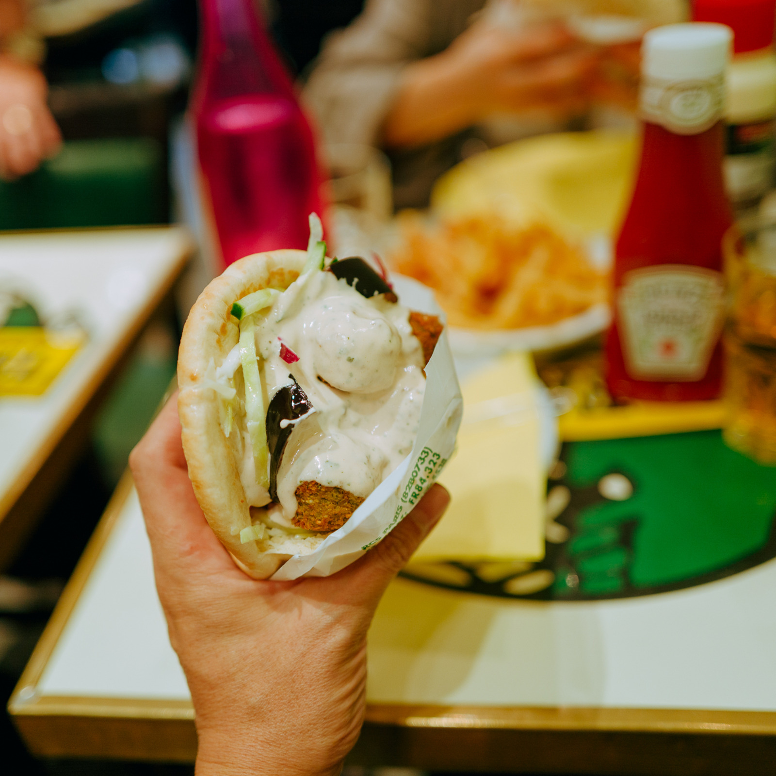 ピカソ美術館に行く前に、腹拵え。玉置さん情報にあった「ラズ・ドュ・ファラフェル」でファラフェルを食べる。ファラフェルというのは、ヒヨコ豆やそら豆のコロッケを、キャベツの千切りや揚げナス、きゅうりに赤キャベツの酢漬けなどと一緒にピタパンではさんだ中東のサンドイッチみたいな食べもの。