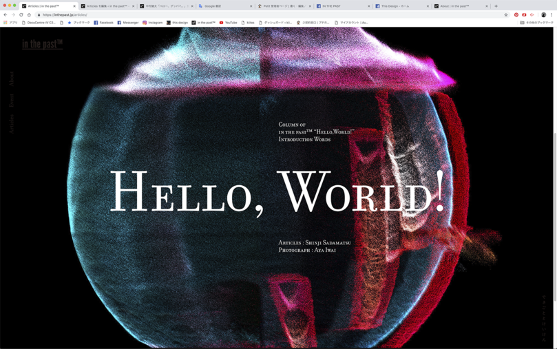 ようやくin the pastのホームページを公開することができました。辛抱強く僕の細かな要望に付き合ってくださった、コーディングの田中さん、お疲れ様でした。素晴らしいサイトができました。引き続きよろしくお願いいたします。ホームページは、in the pastでのイベント情報をはじめ、Hello, World!をテーマに、その時々の僕らの関心や考えなどを、ヴィジュアルとテクストで伝えていきたいと考えています。