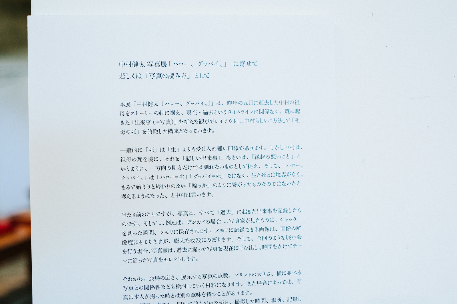 本展「Kenta Nakamura Hello Goodbye(中村健太『ハロー、グッバイ。』)」は、昨年の五月に逝去した中村の祖母をストーリーの軸に据え、現在・過去というタイムラインに関係なく、既に起きた「出来事(=写真)」を新たな観点でレイアウトし、中村らしい〝方法〟で「祖母の死」を俯瞰した構成となっています。
