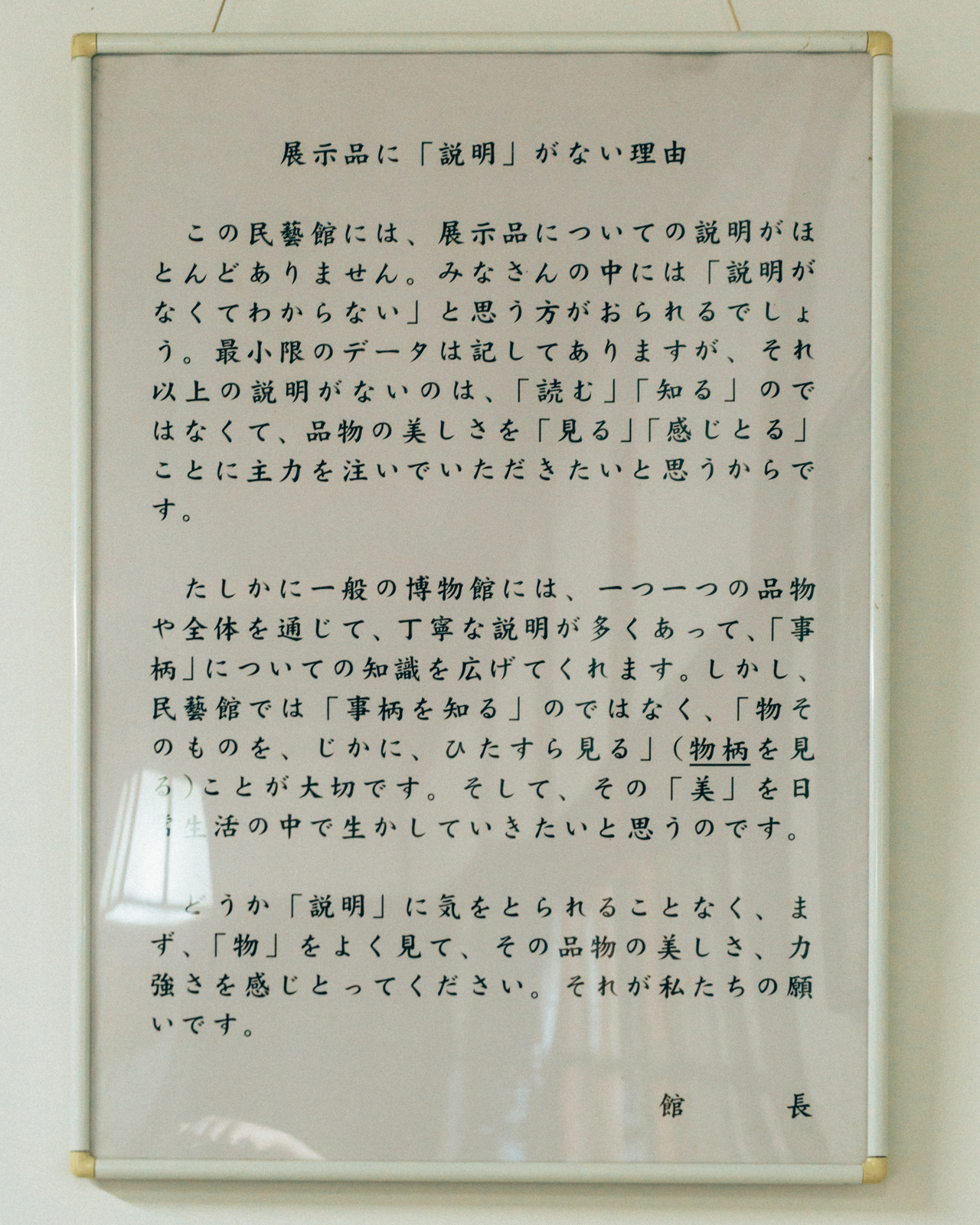 民藝館の展示室への出入り口の所に、民藝館を観覧する者へ宛てた心得を説く書面がある。以下に抜粋する。